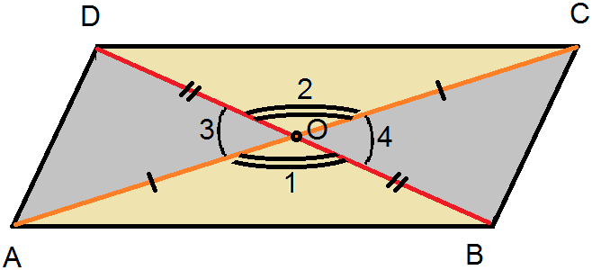 1) их стороны равны AO=OC, OD=OB - пересекаются середины отрезков;
