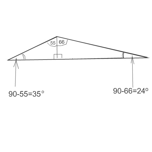 в треугольнике abc проведена высота ch угол c делится высотой ch на два угла градусные величины которых равны 55 и 66 градусов. найдите наименьший из двух оставшихся глов треугольника abc . ответ дайте в градусах