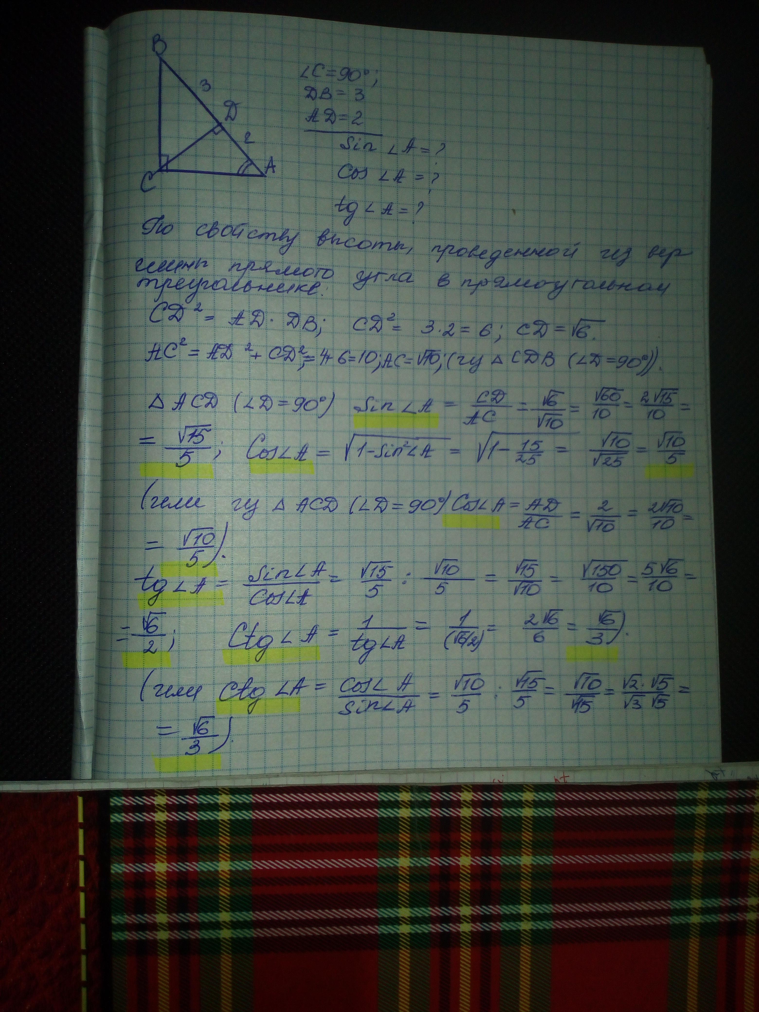 в прямоугольном треугольнике abc угол c=90 градусов cd перпендикулярен ab ad=2 db=3 найти синус косинус тангенс угла a