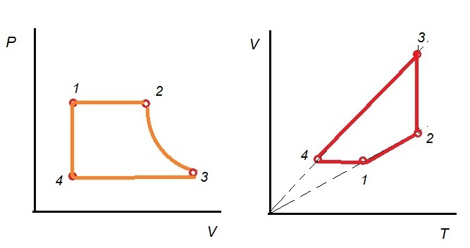 Постройте графики процесса, проходящего с идеальным газом (см. рисунок) в координатах PV и VT. Масса газа постоянна.