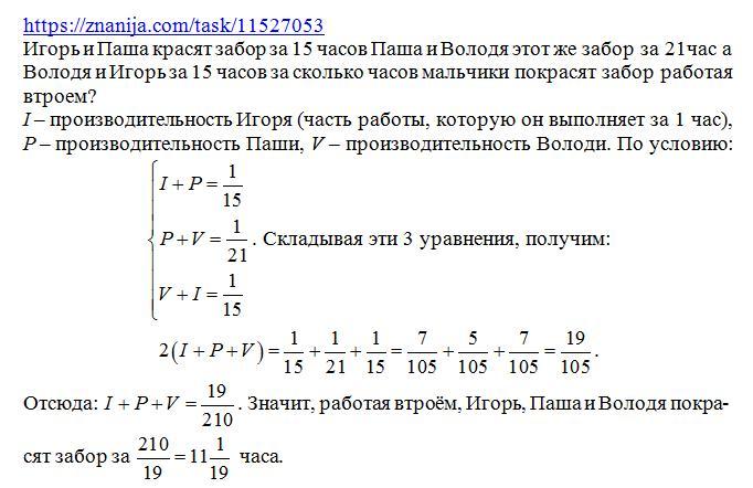 Игорь и Паша красят забор за 15 часов Паша и Володя этот же забор за 21час а Володя и Игорь за 15 часов за сколько часов мальчики покрасят забор работая втроем