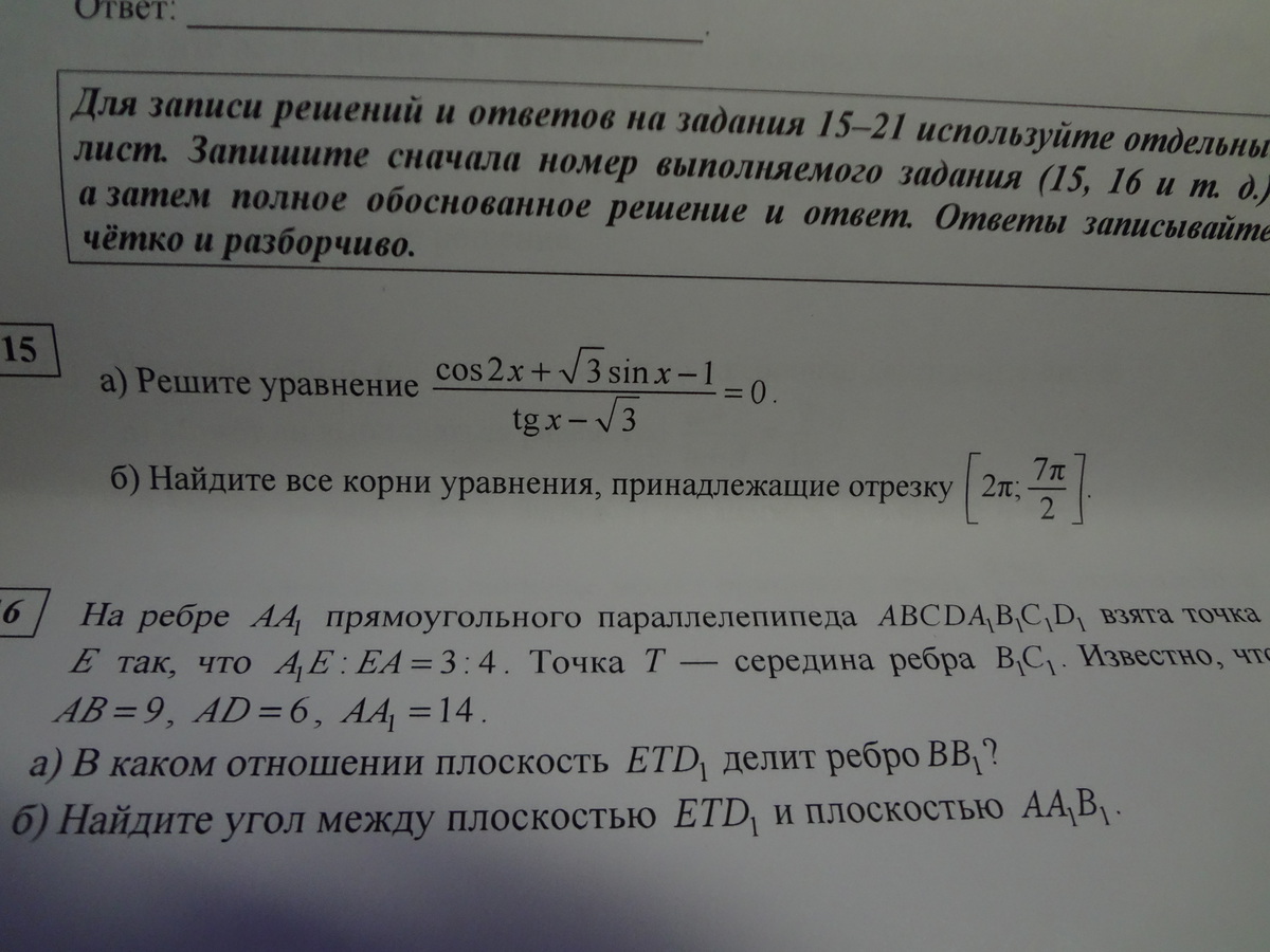 (cos2x+√3*sinx-1)/(tgx-√3)=0 x∈[2π;7/2π] ОДЗ tgx-√3≠√3 x≠π/3+πn