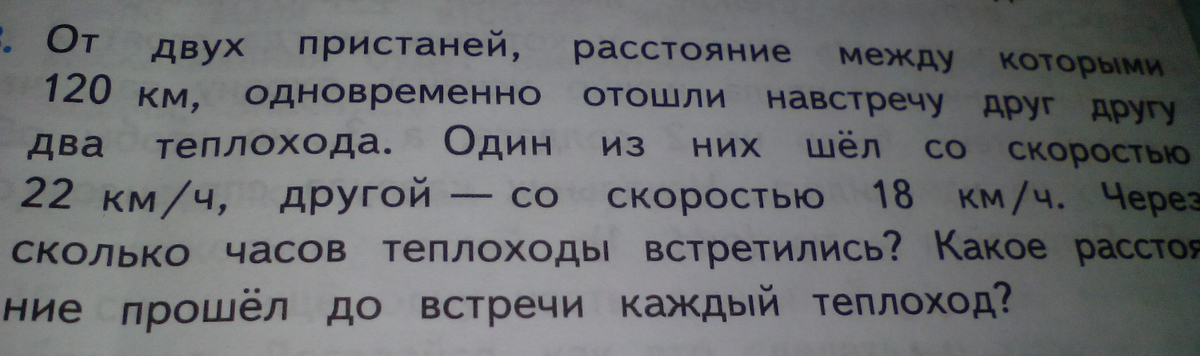Ответ : 1-ый теплоход прошел 66 км;2-ой теплоход прошел 54 км.