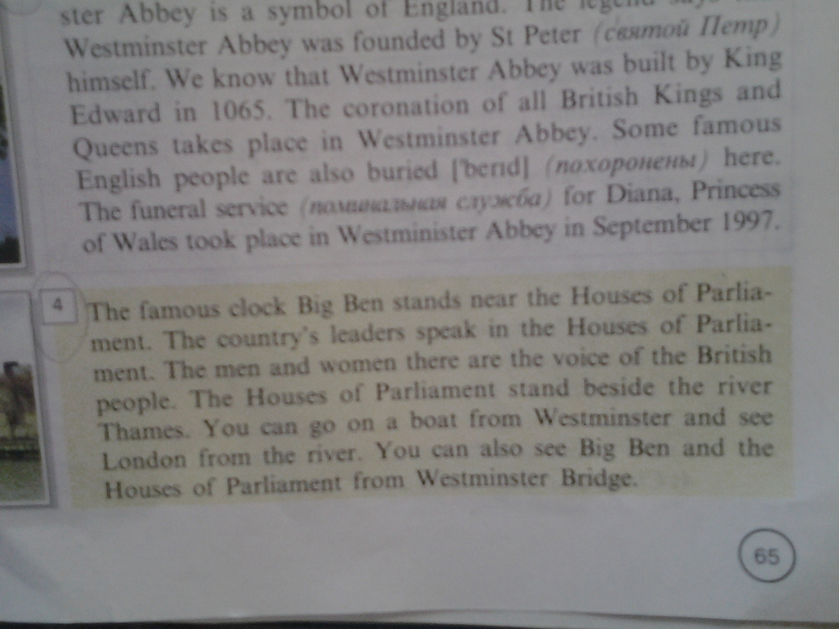Известные часы Биг Бен стоят возле Дома Парламента. Руководитель страны разговаривает в Доме парламента. Мужчины и женщины там – это голос Британских людей. Дом Парламента находится возле реки Темзы. Вы можете взять лодку с Вестминстера и увидеть Лондон с реки. Так же вы можете увидеть Биг Бен и Дом Парламента Вестминстерского моста.