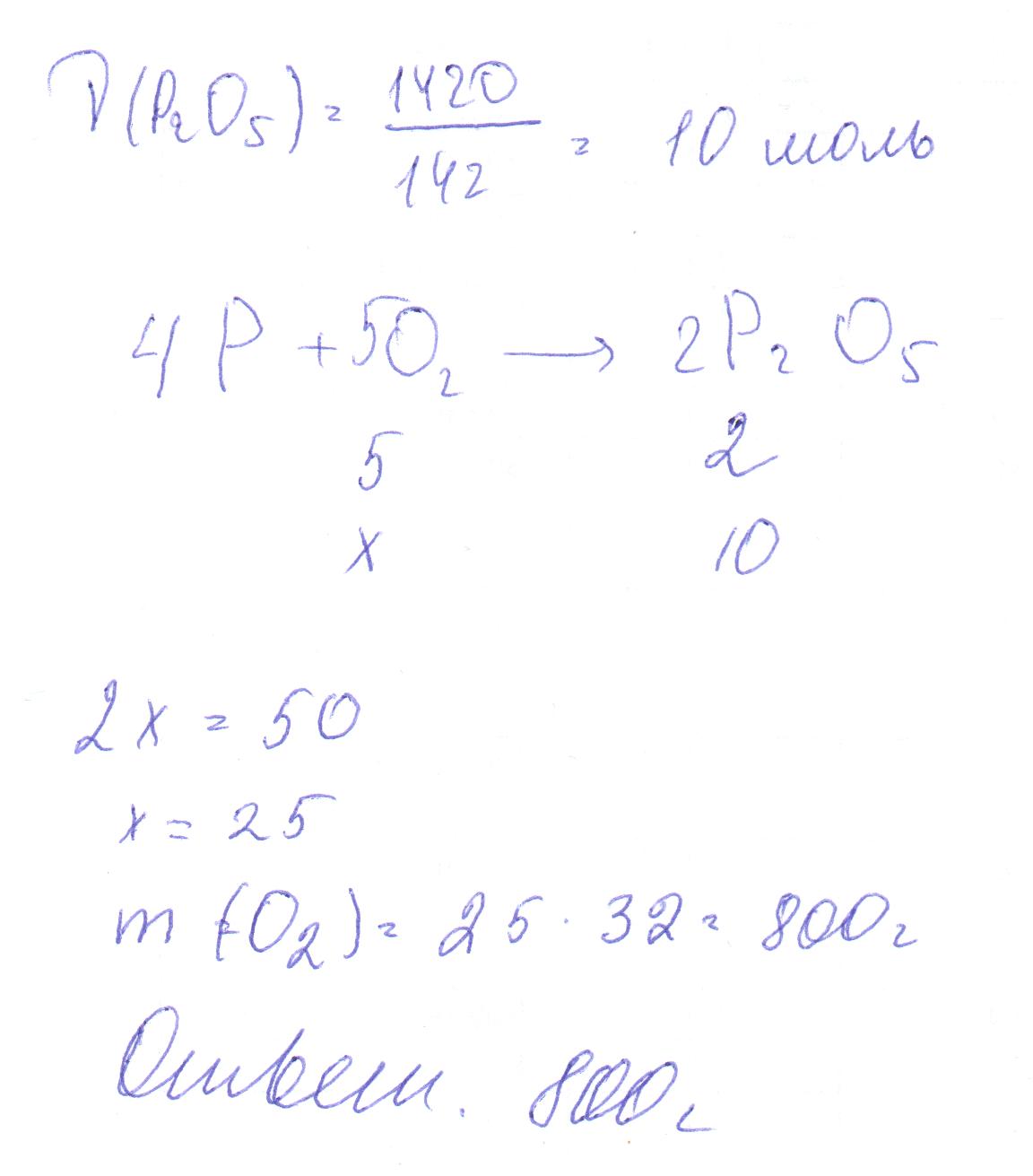 Фосфор сожгли в кислороде, получив оксид фосфора(5), какую массы кислорода затратили, если образовалось 1420г оксида фосфора(5).Решить задачу по уравнению реакции и составить правильное уравнение с коэффициентами.