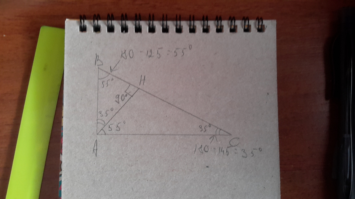 Так как треугольник прямоугольный, можно сказать, что, если разделить его прямой угол на две части, одна из которых будет равна 55, то вторая будет равна 35 градусам.