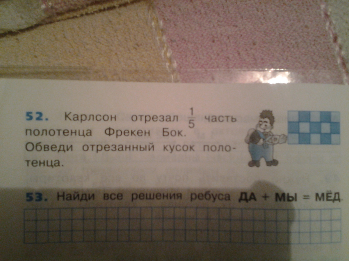 Карлсон отрезал одну пятую часть полотенца Фрекен Бок. Обведи отрезанный кусок полотенца.