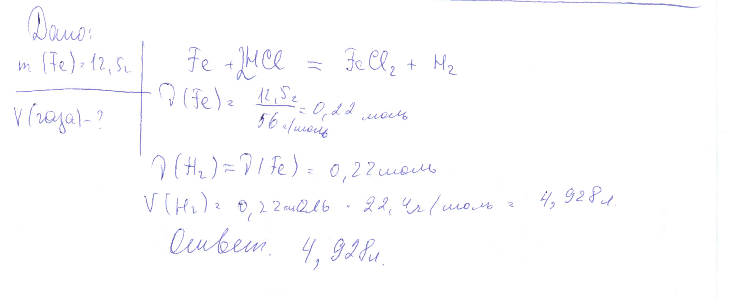 12.5 г железа растворили в избытке соляной кислоты. рассчитайте объем выделившегося в реакции газа