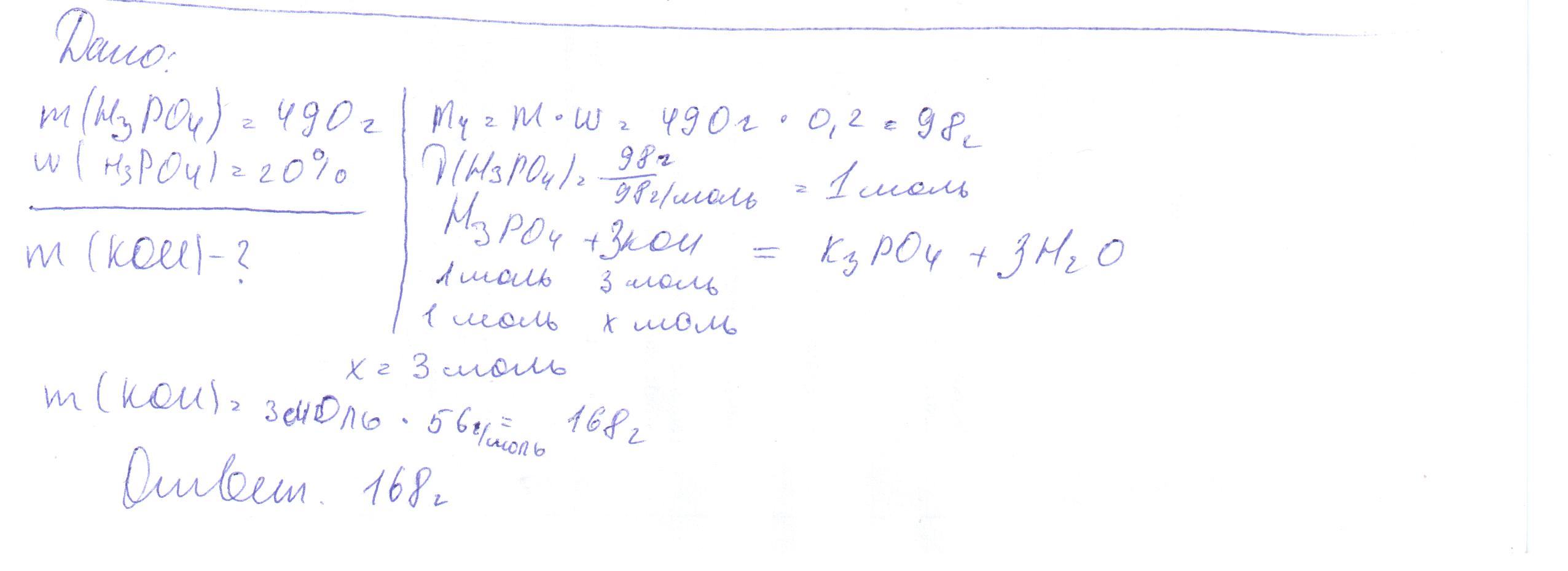 Рассчитайте массу гидроксида калия, необходимую для полной нейтрализации 490г 20% - ного раствора фосфорной кислоты