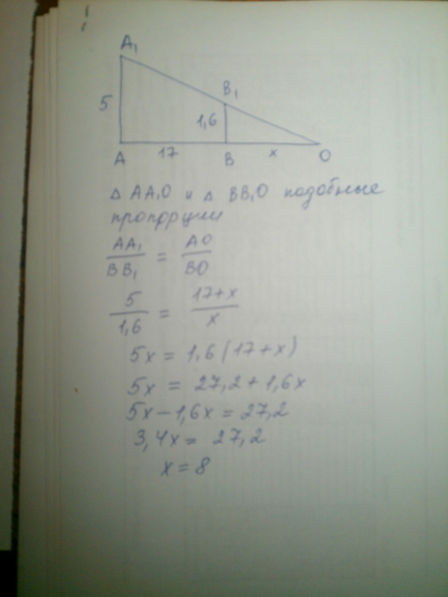 Человек ростом 1.6 м стоит на расстоянии 17 м от столба , на котором висит фонарь на высоте 5 м. Найдите длину тени человека в метрах.