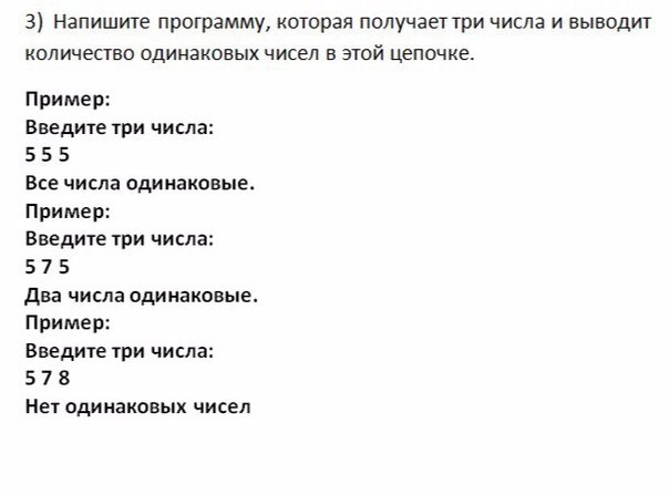 if (a=b) or (a=c) or (b=c) then Writeln('2 числа одинаковых')