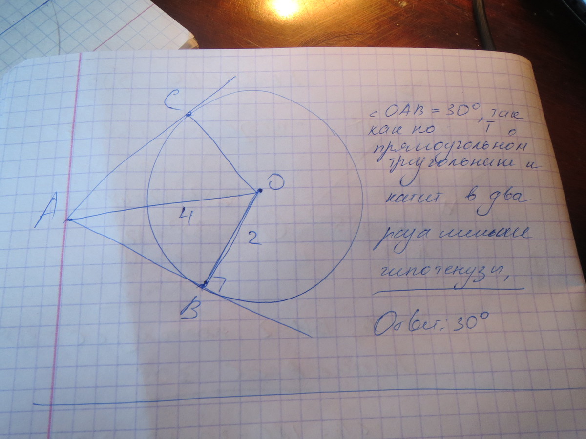Центр окружности-точка О.Радиус окружности равен 2 см.Точка А лежит вне окружности:ОА=4 см.Касательные к окружности,проведенные через точку А,касаются окружности в точках В и С.Найдите градусную меру угла ВАО.