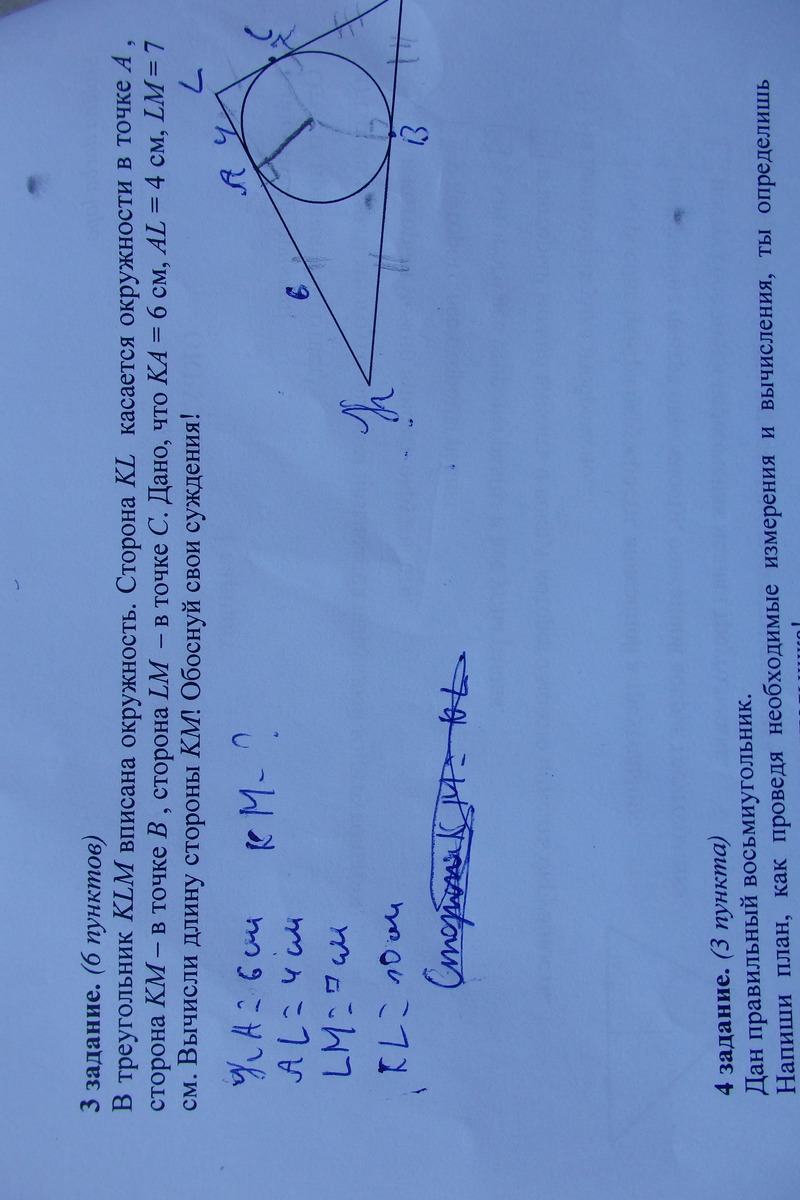 Первая решается по свойству касательной к окружности: касательные, проведенные к окру-ти из одной точки равны, значит КВ=КА=6 см; LC=LA=4 см, тогда ВМ=МС=ML-LC=7-4=3 см. Следовательно, КМ=КВ+ВМ=6+3=9 см.