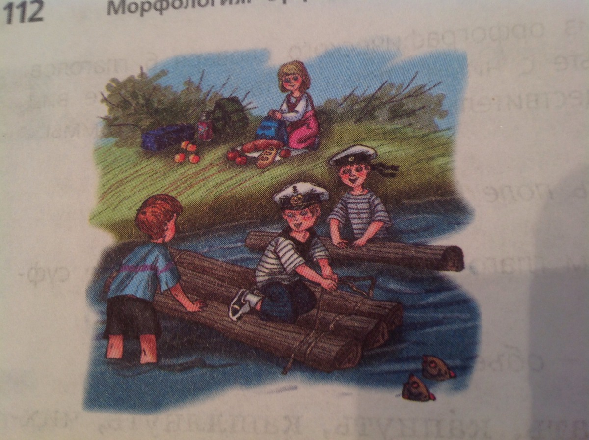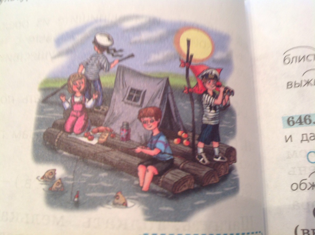 1)Ребята строили плот.Два мальчика,одев матросскую рубашку,взяв два бревна,начали делать плот.Один мальчик связывает бревна. между собой чтобы получился плот,а другой помогает ему,несет бревна..А другой мальчик,без матроской рубашки,просто помогает мальчишкам.А на заднем плане сидит девочка,а сзади ее портфель,еда,фрукты,овощи.
