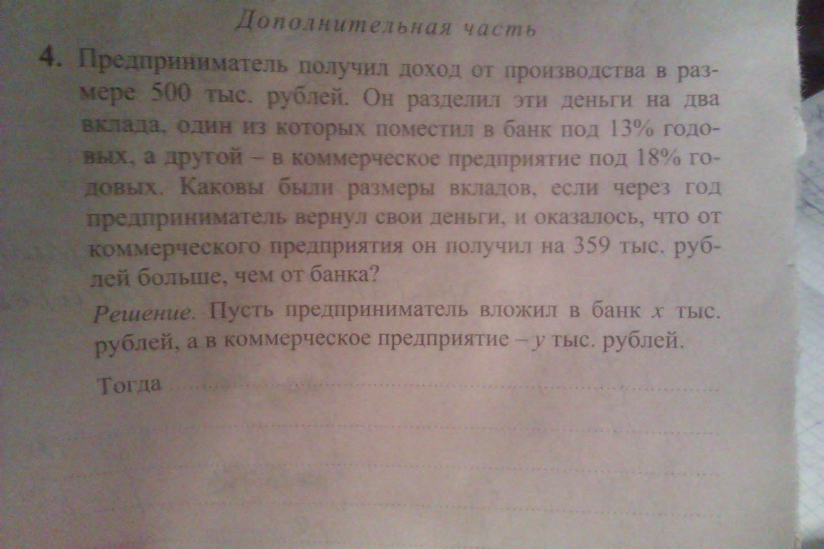 Ответ: в банк было вложено 100 тыс руб, в ком банк было вложено 400 тыс руб
