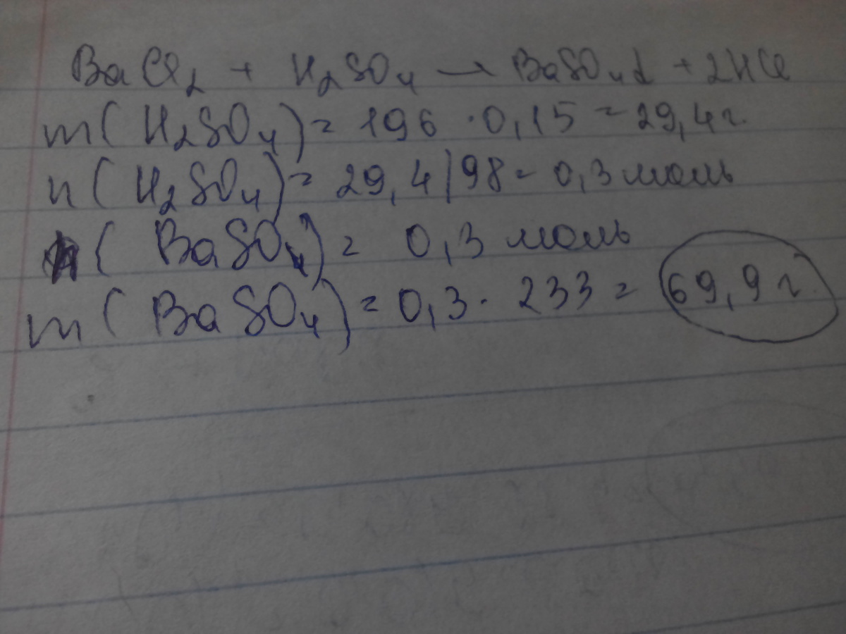 какую массу осадка можно получить в результате реакции обмена между избытком раствора хлорида бария и 196 г раствора серной кислоты с массовой долей 15%?
