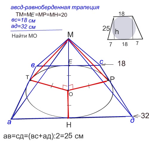 h- высота трапеции равна диаметру вписанной в нее окружности. Расстояние от О до сторон трапеции равно радиусу этой окружности.