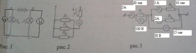 2)Участок цепи состоит из трех сопротивлении R1=20 OM R2=10 OM R3=15 OM. найдите показания вольтметров и амперметров если сила тока через R3 2 А(рис 3)