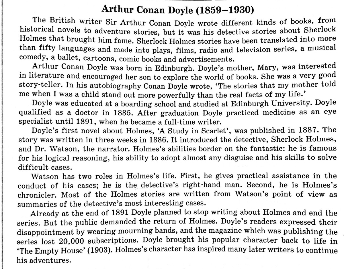 Английский писатель сер Артур Конан Дойл писал разные книги: от исторических романов до приключенческих историй., но его детективы про Шерлока Холмса принесли ему славу. Истории про Шерлока Холмса были переведены на 50 языков, были представлены постановки, фильмы, радио- и телесерии, музыкальные комедии, балеты, мыльтфильмы, комические книги и объявления. Артур Конан Дойл родился в Эдинбурге. Его мать, Мэри, интересовалась литературой и воодушевляла сына узнавать мир книг. Она умела очень хорошо рассказывать. В своей автобиографии Артур Конан Дойл писал: «Истории, которые мне рассказывала мама, когда я был ребенком, засели во мне сильнее, чем реальные факты моей жизни». Дойл учился в школе-интернате и в Эдинбургском университете. Выучился на доктора в 1885 году. После окончания, Дойл практиковался в медицине, как окулист до 1891 года, когда он стал заниматься литературой. Первый роман Дойла о Шерлоке Холмсе «Этюд в багровых тонах» был напечатан в 1887 шлду. История была написана за три недели в 1866 году. Она знакомила детектива Шерлока Холмса и доктора Ватсана. Возможности Холмса были на грани фантастики: отличное рассуждение, возможность принимать все замаскированное, и способность решать сложные задачи. Ватсон сыграл две роли в жизни Холмса. Первое – он ассистировал в управлении делами, он правая рука детектива. Второе – он летописец (скорее, тот, кто описывал детектива) Холмса. К 1891 году Дойл планировал прекратить писать о Холмсе и закончить серии. Но публика требовала возвращения Холмса. Читатели Дойла выражали свое недовольство, надевая траурные ленты, и журнал, который был напечатан 20000 копиями (вот на счет этого предложения не уверена). Дойл вернул своего популярного героя к жизни в «Пустом доме» (1903 год). Характер Холмса вдохновлял многих следующих авторов продолжить его приключения.