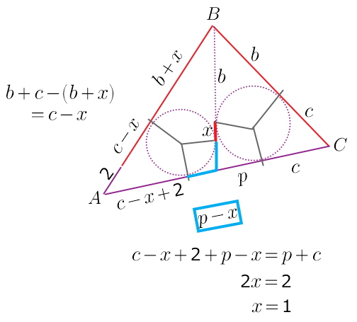 Очень интересно, с удовольствием посмотрю на решение. Мне кажется, что можно найти радиусы окружностей, т.к. одна сторона у маленьких треугольников общая, вторые - пропорциональны, а третие - равны.