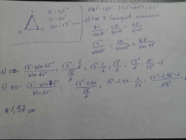 Решите треугольник BCD, если угол В=45 градусов , угол Д=60 градусов,ВС=Корень из 3 см.