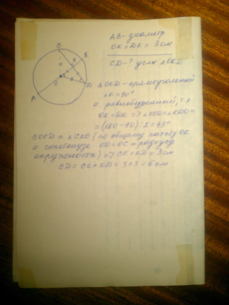 точка О центр окружности. АВ диаметр . CD хорда. диаметр АВ перпендикулярен CD. точка их пересечения - К. ОK = DК = 3 см. Найдите : 1 ) длину хорды. 2)градусную меру каждого угла треугольника ОКD