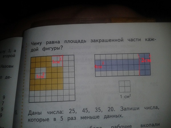 вычитаем 2 пустых квадратика (1 в середине и 1 вверху справа -2 см ²