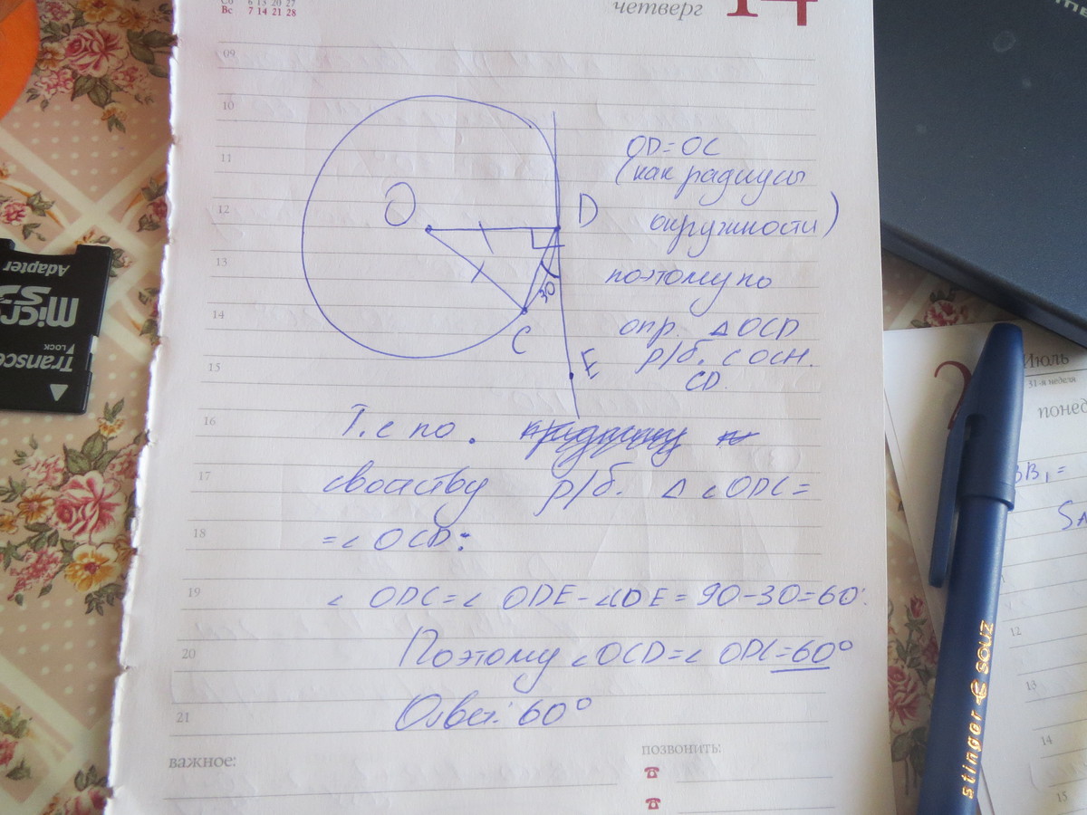 О цетр окружности. точки С и Д лежат на окружности. ДЕ касательная к окружности проходящая через Д. угол ЕДС =30° . найдите угол ОСД