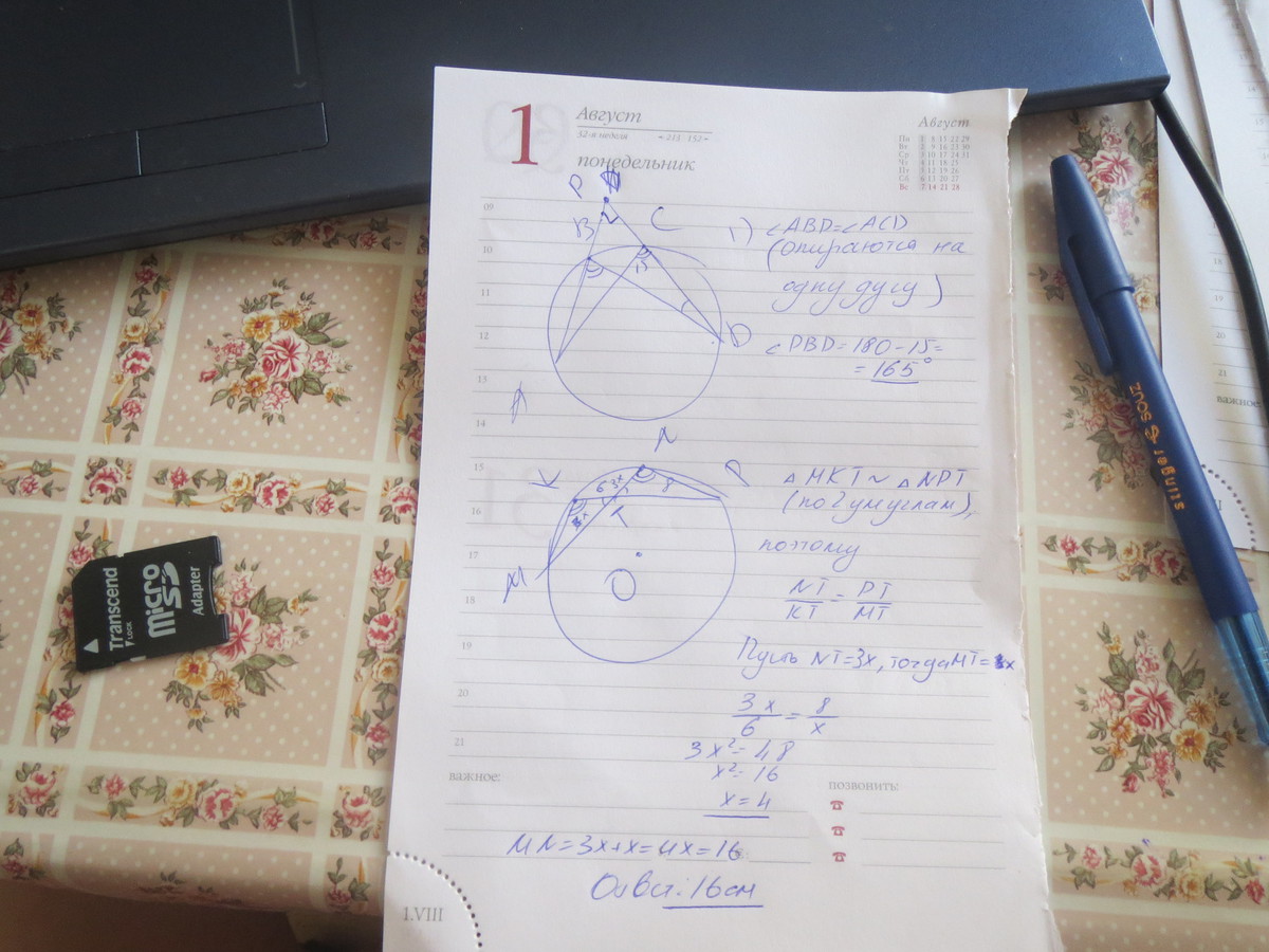 Дана окружность с центральной точкой O. Хорды MN и KP пересекаются в точке Т. Найдите MN, если KT = 6 см, PT = 8 см, а длина MT в три раза меньше длины NT.