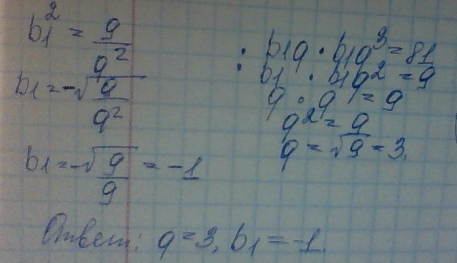 Найдите знаменатель и первый член геометрической прогрессии, если произведение первого и третьего ее членов равно 9, а произведение второго и четвертого равно 81, причем , b1<0