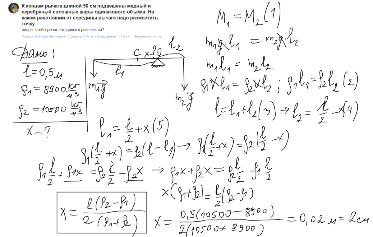 точку опоры, чтобы рычаг находился в равновесии. Плотность меди = 8900 кг/м3, плотность серебра = 10500 кг/м3. поиск