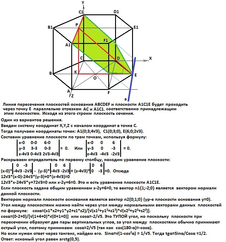 В правильной шестиугольной призме ABCDEFA1B1C1D1E1F1 сторона основания равна 4, а диагональ боковой грани равна 5, найдите угол между плоскостью А1С1Е и плоскостью основания. ВНИМАНИЕ: ОТВЕТ: arctg0,5. МНЕ НУЖНО ПОДРОБНОЕ РЕШЕНИЕ ЗАДАЧИ (ЖЕЛАТЕЛЬНО С РИСУНКОМ) Подсказка: 1) Ввести систему координат; 2) Вычислить координаты точек А1, С1, Е; 3) Задать вектор нормали через уравнение плоскости; 4) Угол между плоскостями. ПРОШУ СРОЧНО