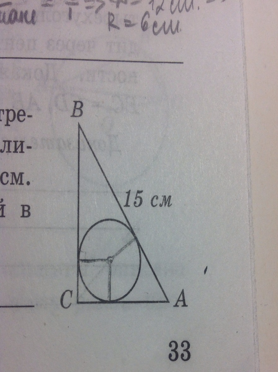 Периметр прямоугольного треугольника АВС равен 36 см. Длина гипотенузы составляет 15 см. Чему равен радиус вписанной в треугольник АВС окружности? Ответ: 3 см. Помогите написать решение)