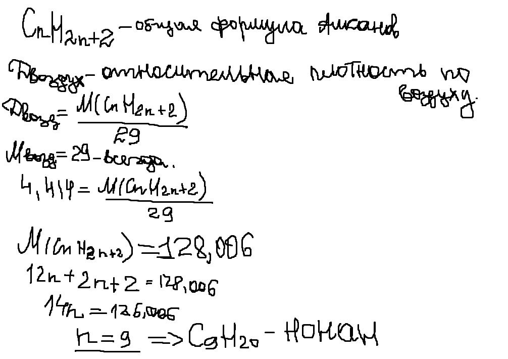 M(CnH2n+2) = 12n + 1(2n+2) = 12n+2n+2 = 14n+2 = 128 г/моль, отсюда 14n = 128-2 = 126, n = 126/14 = 9, следовательно, формула алкана С9Н20. Выполним проверку: M(C9H20) = 12x9+1x20 = 108+20 = 128 г/моль, формулу определили верно.