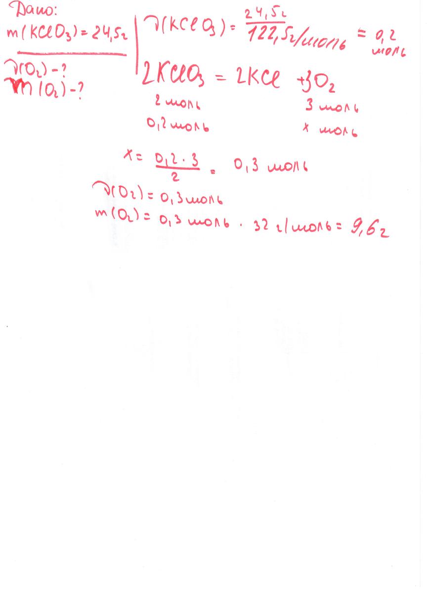 Расчитать количество вещества и массу кислорода, образующегося при разложении 24.5 г хлората калия(KCIO3)