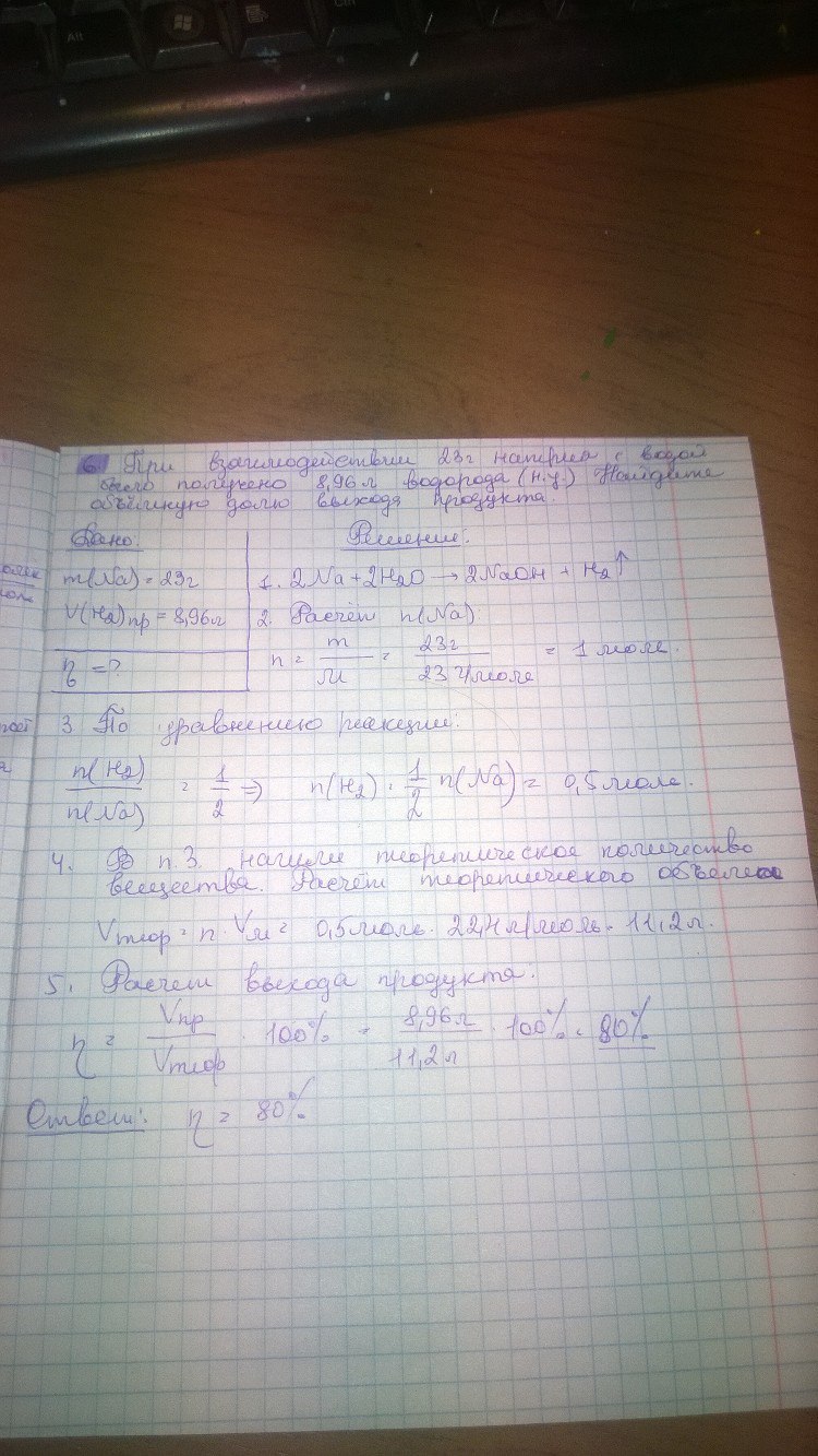 При взаимодействии 23 г натрия с водой было получено 8,96 л водорода (н.у). Найдите объемную долю выхода продукта реакции.