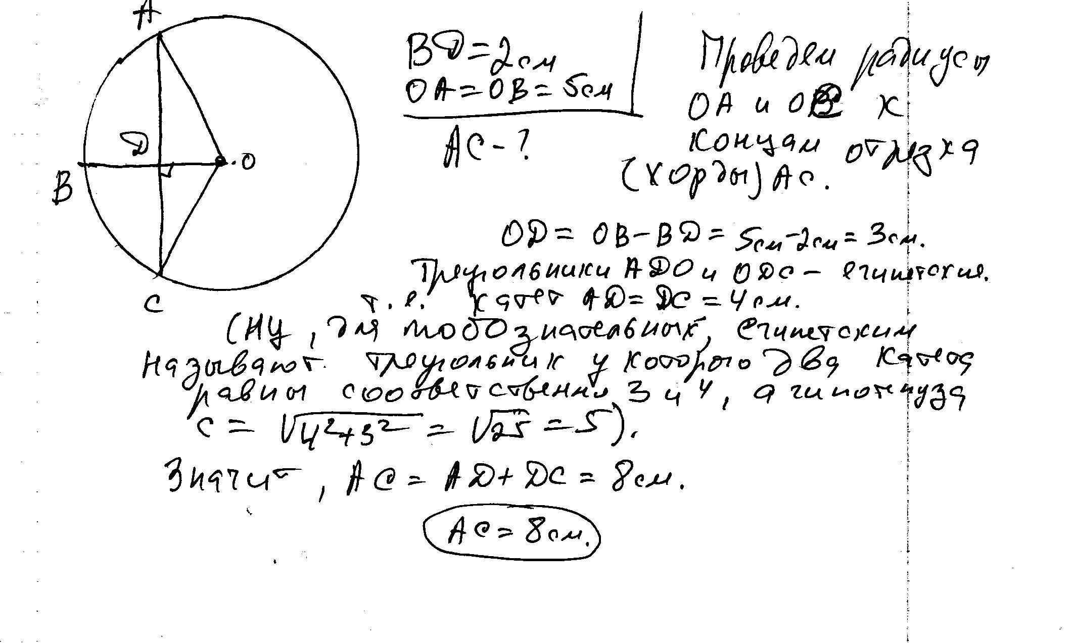 радиус ОВ окружности с центром в точке О пересекает хорду АС в точке Д и перпендикулярен ей.найдите длину хорды АС если ВД=2 см,а радиус окружности равен 5 см