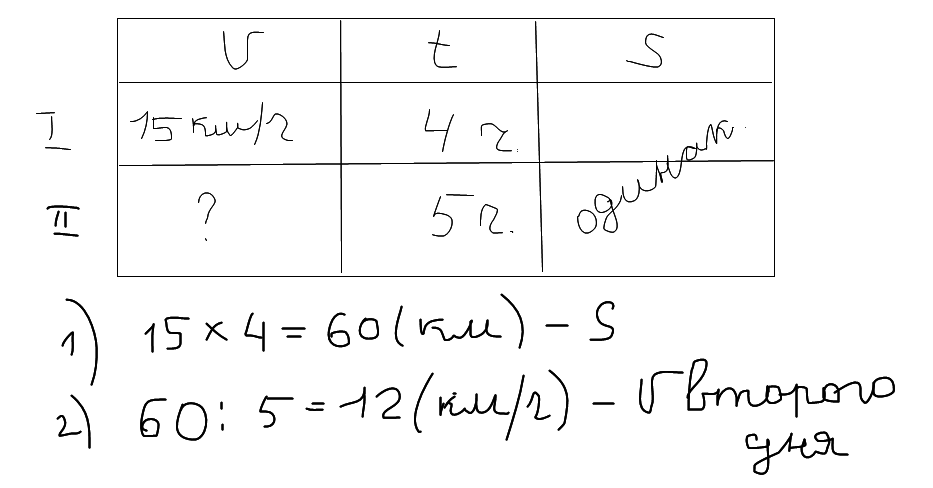 В первый день туристы ехали на велосипедах 4 часа со скоростью 15км/ч. Во второй день они проехали на велосипедах такое же расстояние, но за 5 часов. С какой скоростью ехали туристы на велосипедах во второй день?