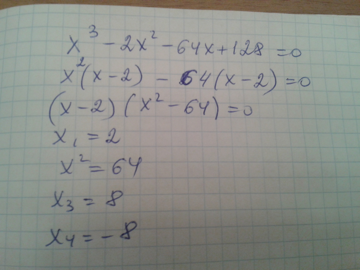 Помогите решить.(Если кому не понятно, то икс в третий степени минус два икс в квадрате минус шездесят четыре икс плюс сто двадцать восемь равно нулю)
