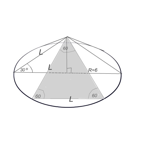 Радиус основания конуса равен 6 см., а образующая наклонена к плоскости основания под углом 30 градусов Найдите площадь сечения, если угол между образующими равен 60 градусов.