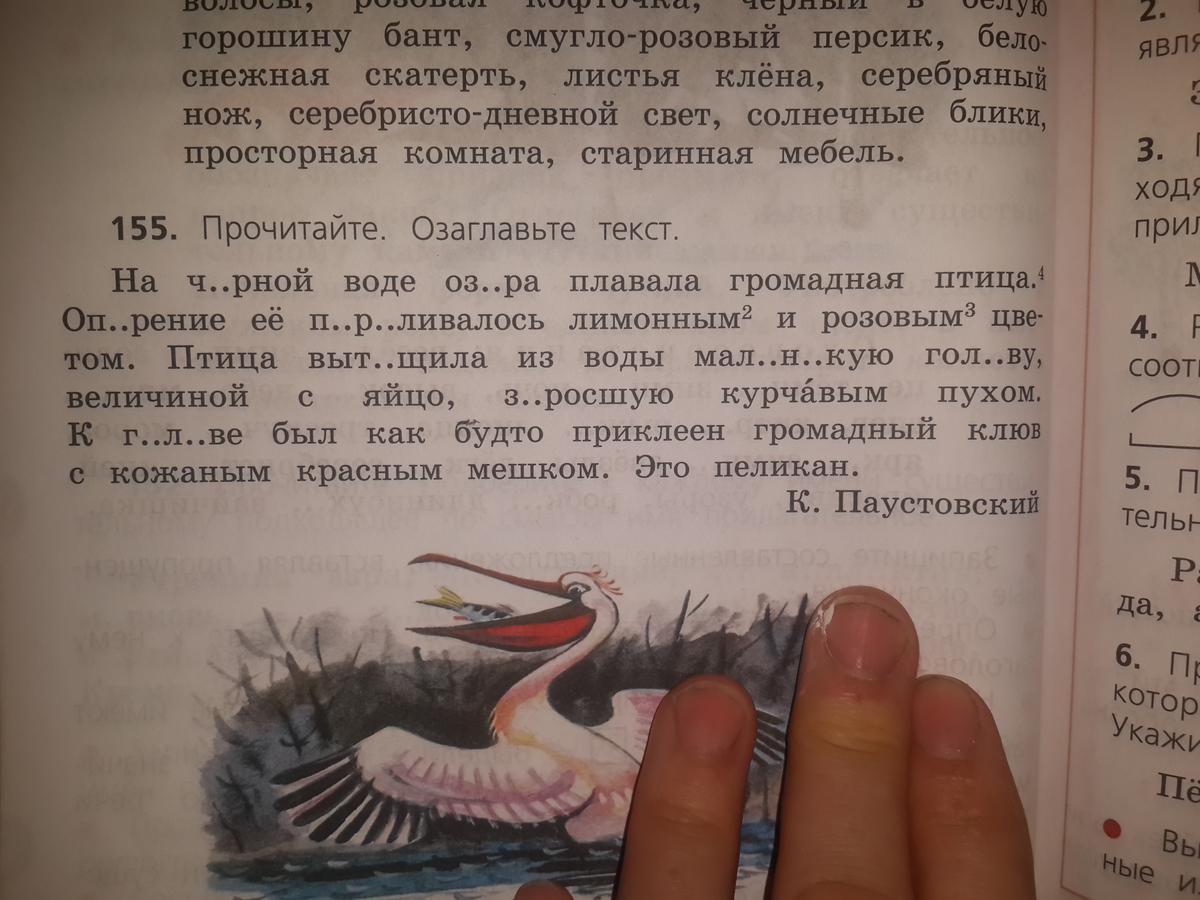 На чёрной воде озера плавала громадная птица. Оперение её переливалось лимонным и розовым цветом. Птица вытащила из воды маленькую голову, величиной с яйцо, заросшую курчавым пухом. К голове был как будто приклеен громадный клюв с кожаным красным мешком. Это пеликан.