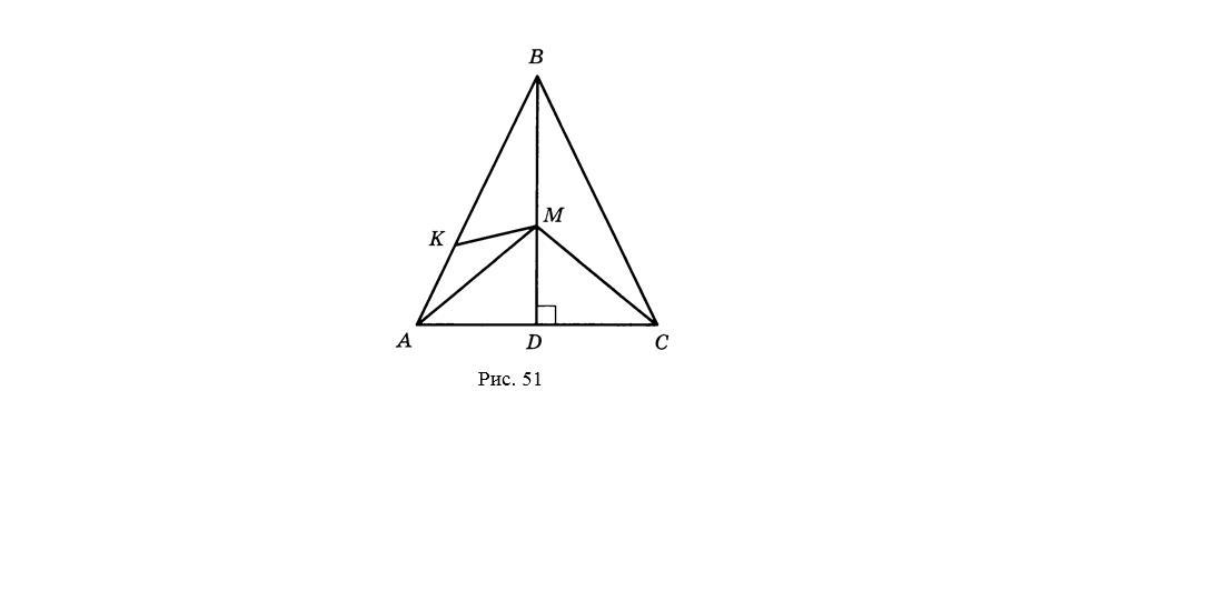 На рисунке 51 треугольник АВС равнобедренный (АВ=ВС), ВD перпендикулярна АС, угол АКМ=углу ВМА, АВ=17, АС=16, МD=6. Докажите, что треугольнику