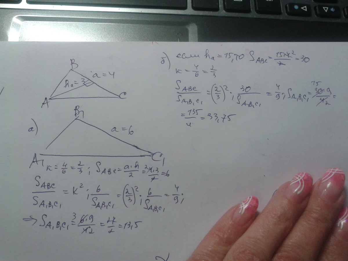 Дан треугольник. сторона a=4 cm, высота Ha= 3cm. Найти площадь подобного треугольника если а) его сторона равна a = 6cm b) Ha = 15 cm