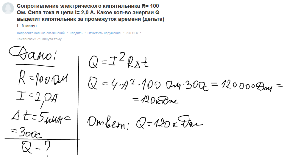 Сопротивление электрического кипятильника R= 100 Ом. Сила тока в цепи I= 2,0 А. Какое кол-во энергии Q выделит кипятильник за промежуток времени (дельта) t= 5 минут.
