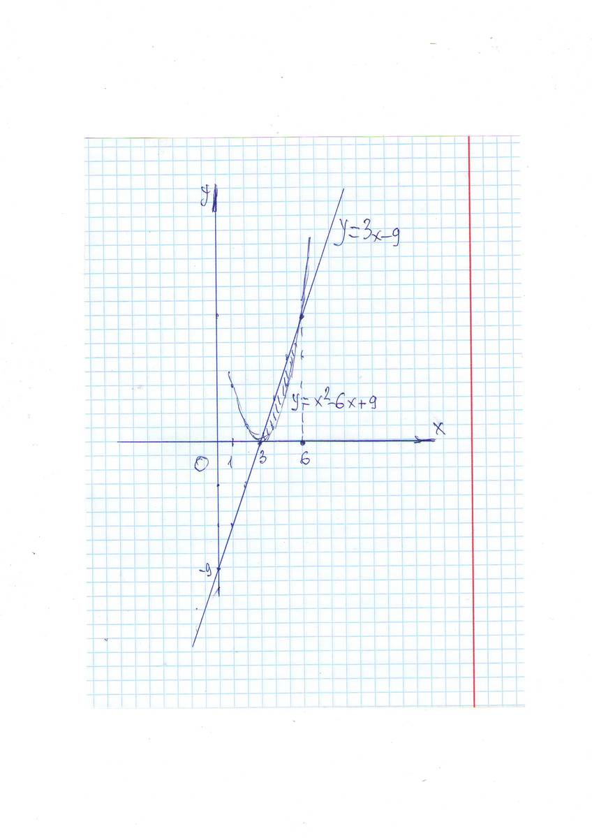 Прямая у = 3х -9 выше параболы. Значит, площадь фигуры будем искать так: а) ищем интеграл от (3х - 9)dx, потом б) интеграл от (х² - 6х +9)dx и в) выполним вычитание.