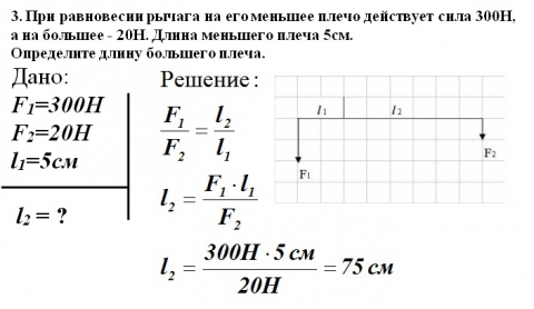 На меньшее плечо рычага действует сила 300 Н, на большее – 20 Н. Длина меньшего плеча – 5 см. Определите длину большего плеча. Сделайте рисунок.