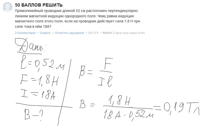 Прямолинейный проводник длиной 52 см расположен перпендикулярно линиям магнитной индукции однородного поля. Чему равна индукция магнитного поля этого поля, если на проводник действует сила 1,8 Н при силе тока в нём 18А?