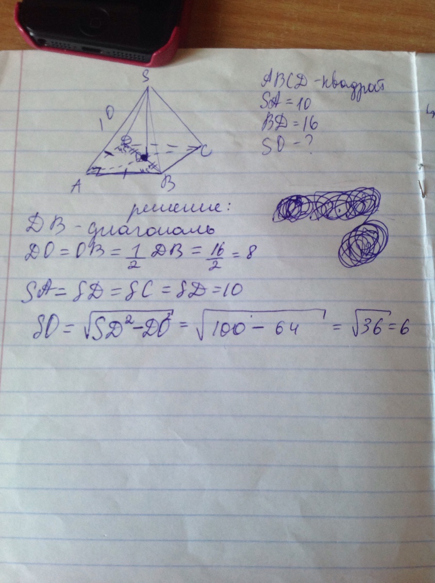 в правильной четырехугольной пирамиде Sabcd точка О центр основания, S-вершина, SA=10, BD=16. Найдите дли отрезка SO.