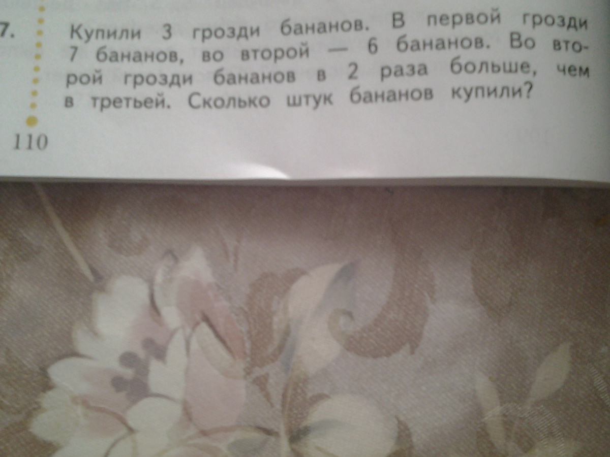 Купили 3 грозди бананов.В первой грозди 7 бананов,во второй 6 бананов.Во второй грозди бананов в 2 раза больше, чем в третьей.Сколько штук бананов купили подруге надо срочно