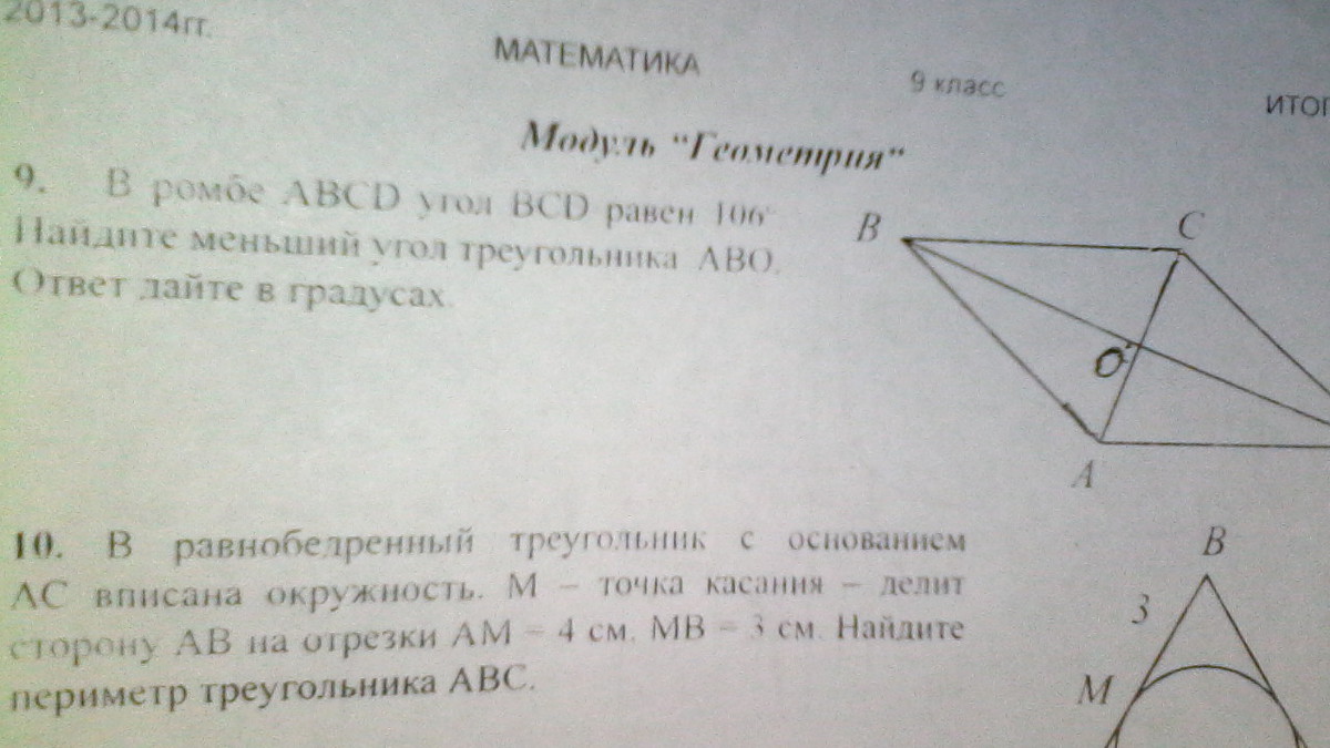 Так как это ромб, то противолежащие углы равны, значит, меньший угол равен (360-106*2)/2=74